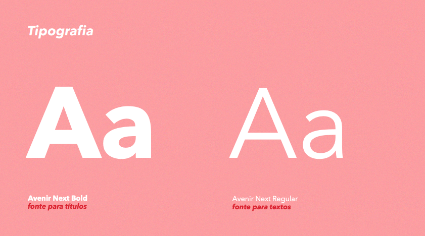 A escolha da Avenir Next traz contemporaneidade e clareza, sem peso institucional. Seu traço geométrico, mas fluido, reforça modernidade e acessibilidade. O contraste de pesos permite hierarquia limpa, fundamental para a comunicação em múltiplos pontos de contato (posts, embalagens, displays).